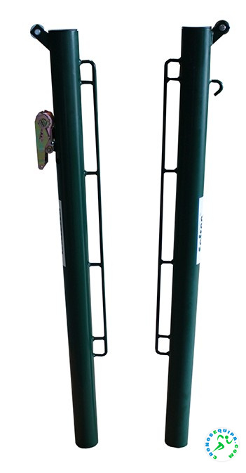 Juego de postes fabricados en acero de sección redonda de 80mm. Diseñados para anclar al suelo mediante botes metálicos - no incluidos- empotrados en zapata de hormigón. Incluye carraca tensora para poder tensar el cable de la red que se quiera colocar. Se fabrican para que la red quede a la altura reglamentaria de 1,07mts. Importante: Este producto se debe anclar siempre al suelo.