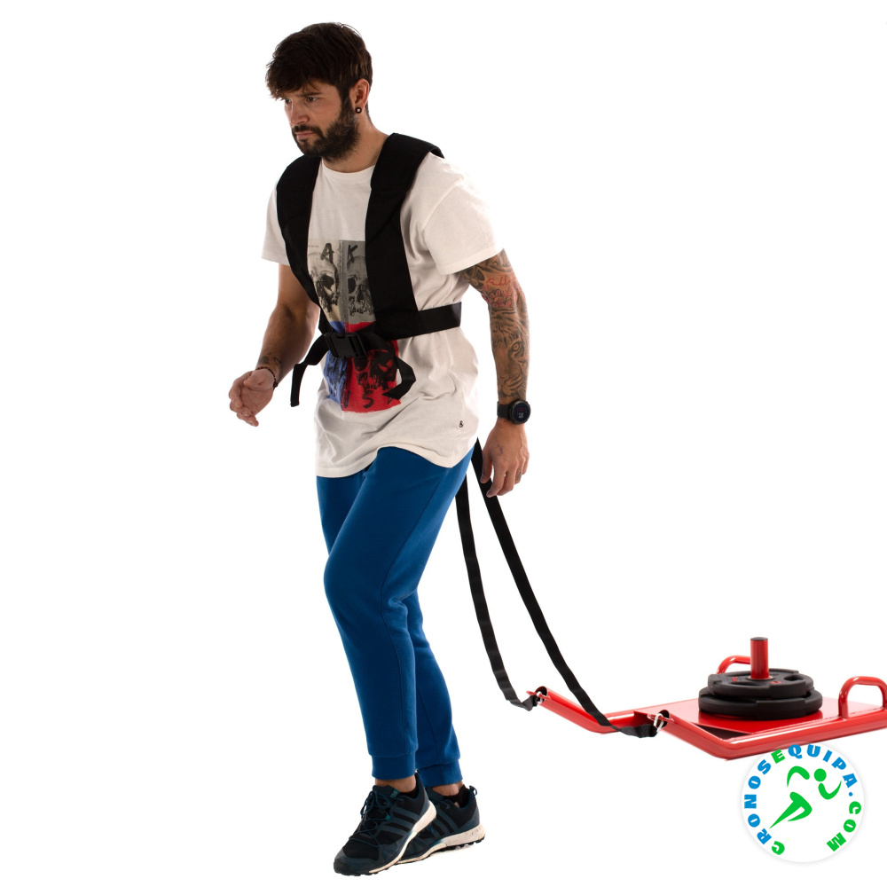 Trineo de tiro para el desarrollo de la fuerza y otro tipo de entrenamientos. Cuenta con base metálica con soporte para cargar discos y arnés para empuje. Adecua el peso en función de tu entrenamiento. Discos no incluidos. Para discos de 5